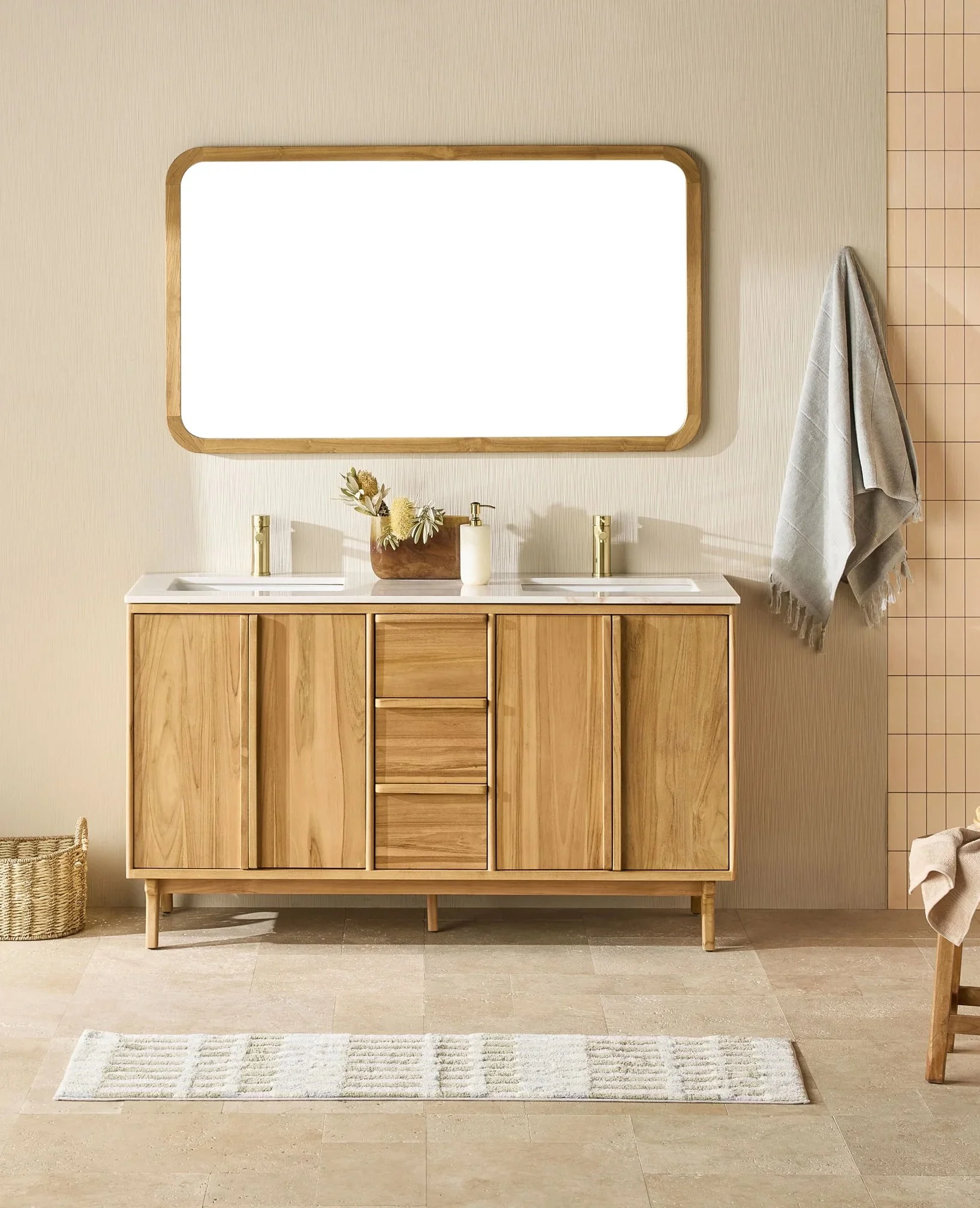 If your decorating style is mid-century modern, we think you’ll absolutely adore the Remi vanity from Early Settler. The solid teak timber adds warmth to any bathroom and the silhouette is really complementary for that mid-century style. We’d pair it with a square mosaic tile and orb wall lights for a quintessential modernist look. This vanity comes with stone benchtop and undercounter basins for a seamless look.