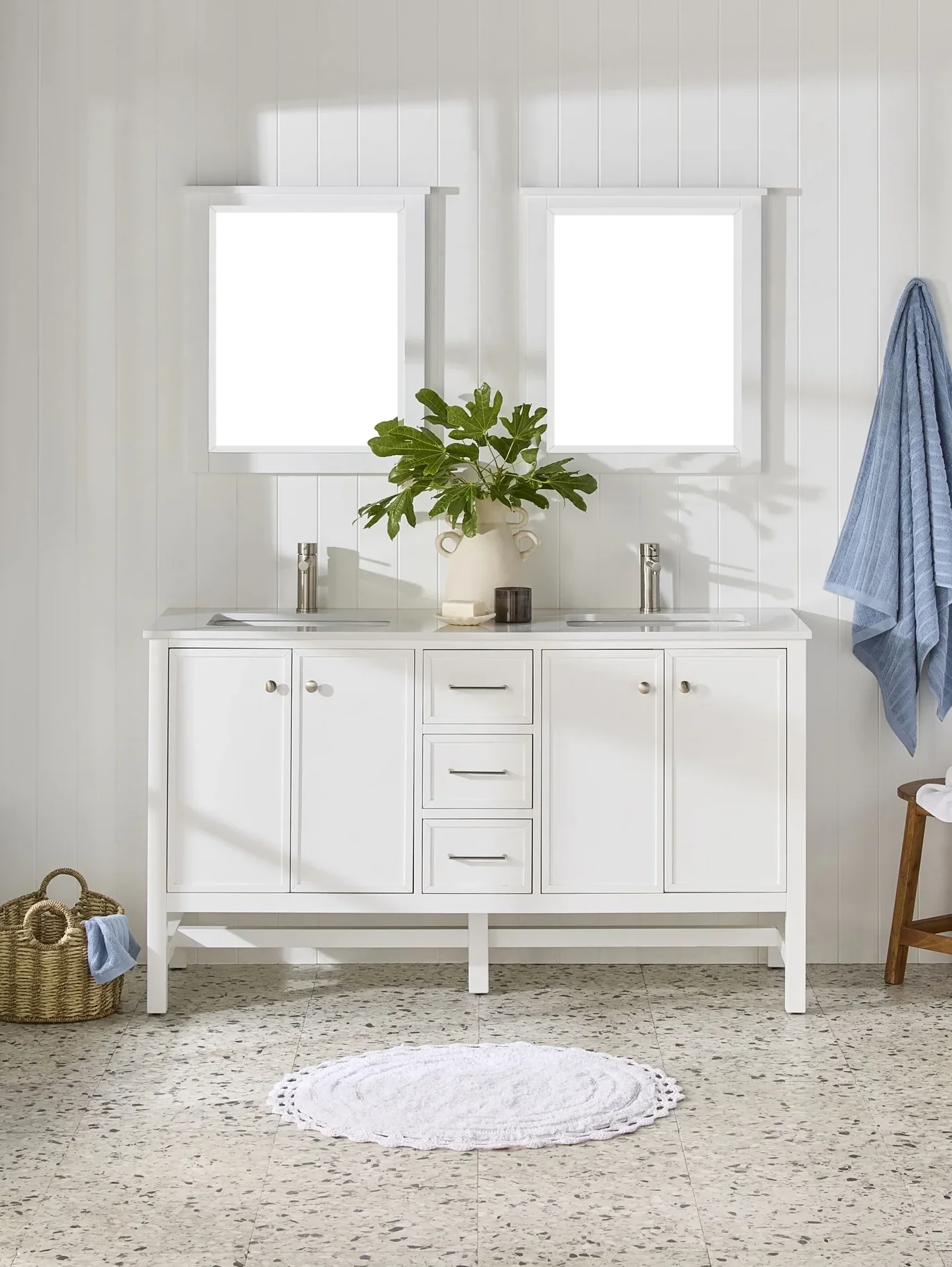 If your style is more modern farmhouse, we think you’ll love the Liam vanities available in White and Evergreen Fog (a beautiful soft sage green pictured below). It comes in three sizes, and with a smooth white benchtop and undermount sink/s. This style is nice and classic and would also suit coastal or Hamptons-style interiors.