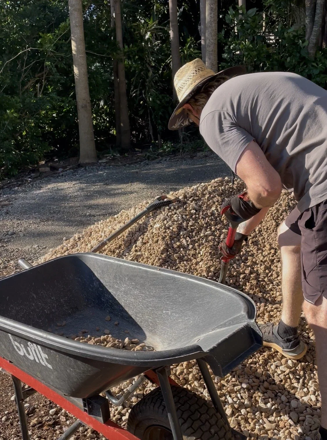 Shovelling pebbles into the wheelbarrow