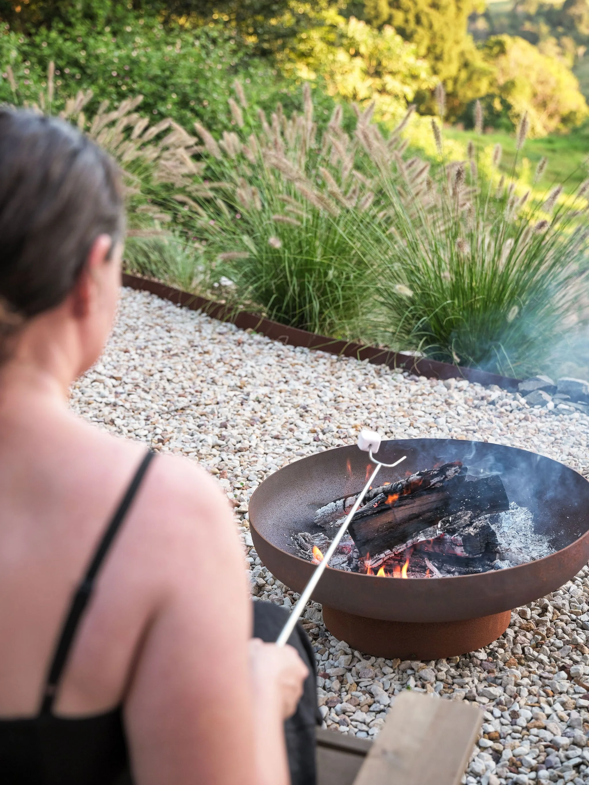 This space isn’t very big, so we have chosen a smaller fire pit from Milkcan. This is the Phoenix 700mm size in the rust finish. I love the shape of this one and the lower height makes it easy to toast marshmallows. We’ve paired it with two of these Cape Cod chairs from Bunnings.