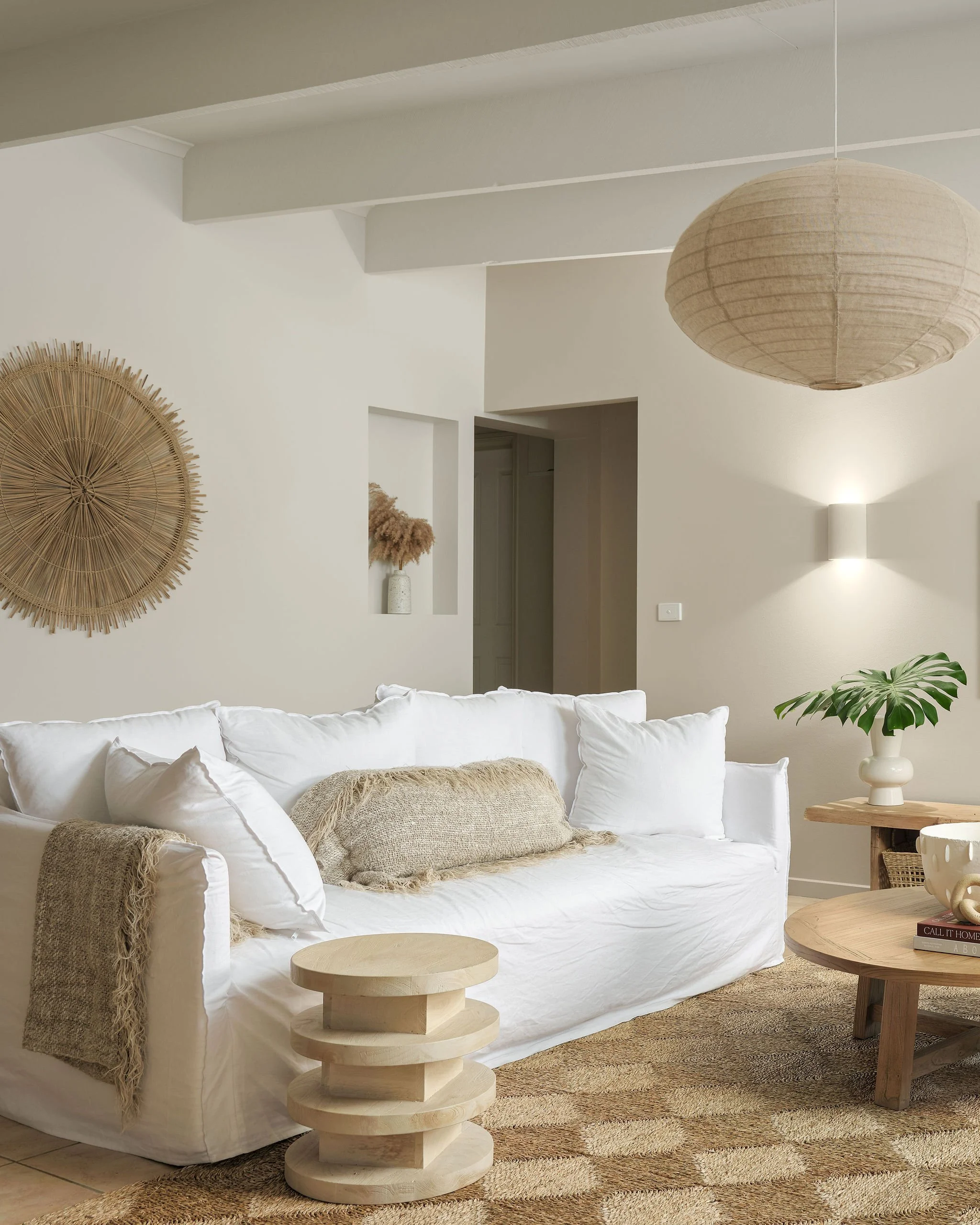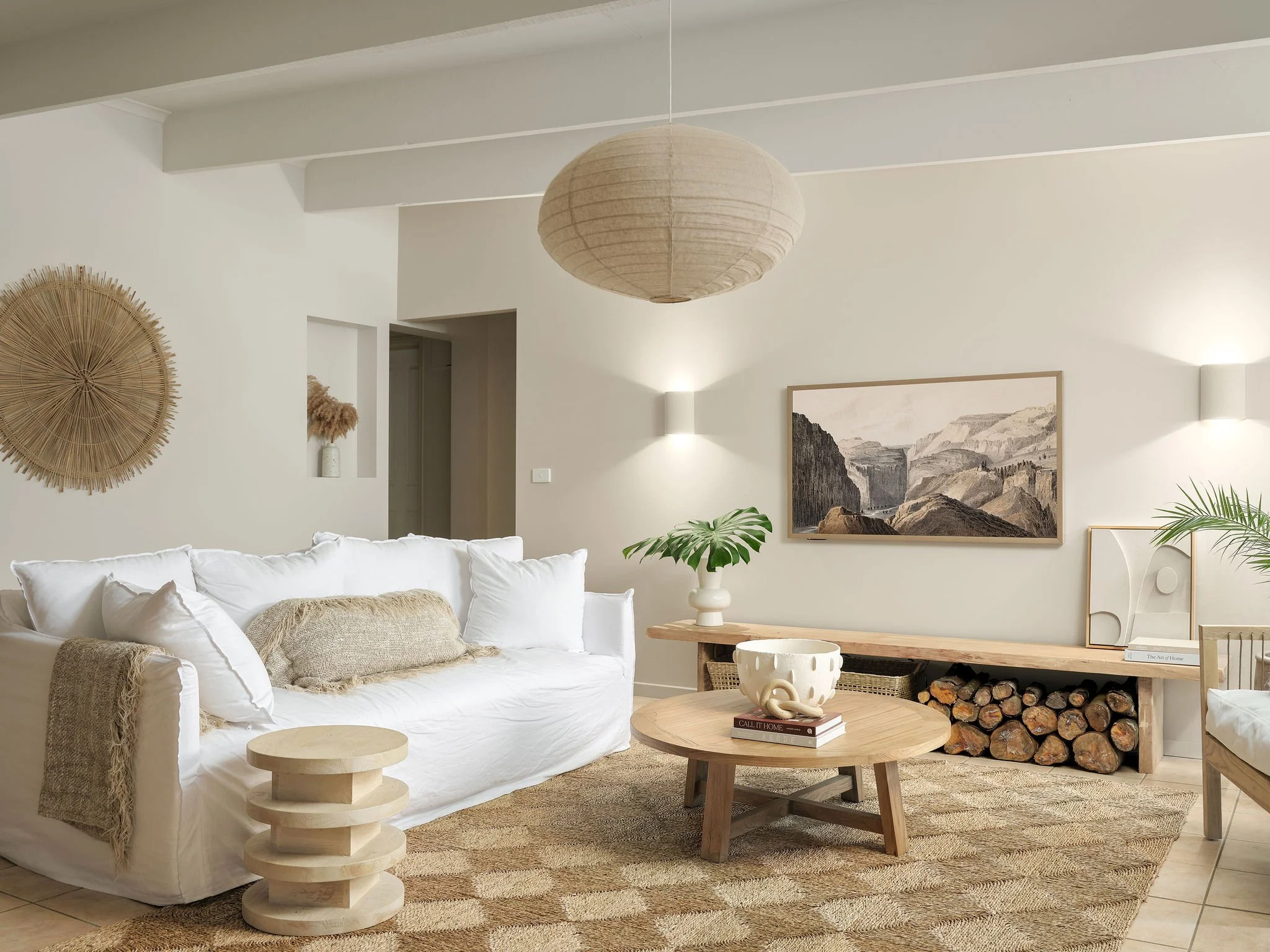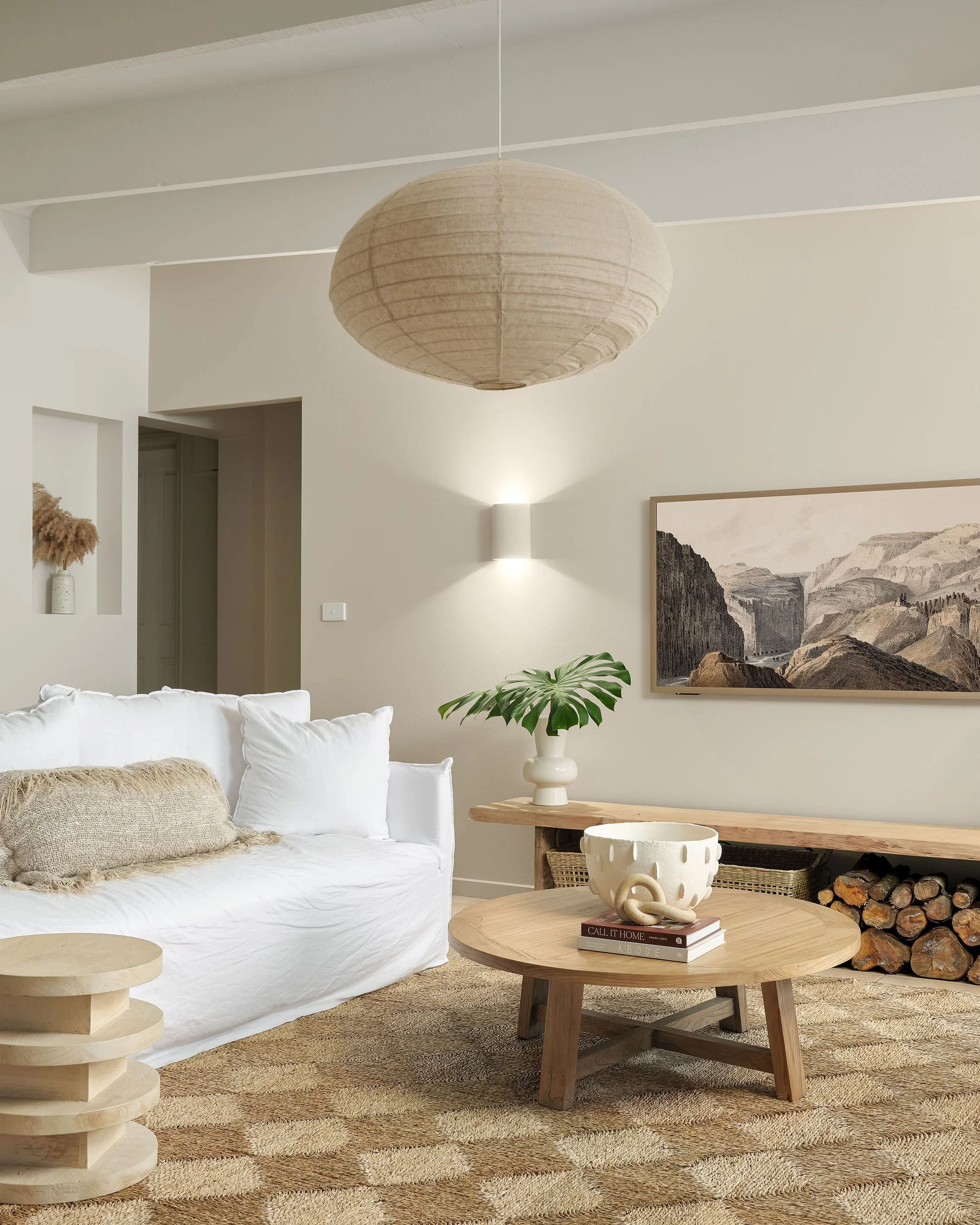 The other major improvement we made to the space was replace all of the lighting. Prior to our makeover, the existing lights didn’t give a lot of light at night, we found this room dark and dismal. I had the wall lights replaced with these stunning ‘Fjord’ up/down wall lights from Beacon, and also moved them down so they weren’t sitting up so high. These are a creamy stone colour, made from concrete with a slightly dimpled texture. They work so well with our wall colour, I just love the amount of light they produce too, it’s no longer dark and dingy at night. I also replaced the ceiling fan with this stunning ‘Tamarind’ natural pendant light from Beacon - it has a lovely warm glow at night, and I love the proportion of it with the space too - it just feels like it’s meant to be in here.