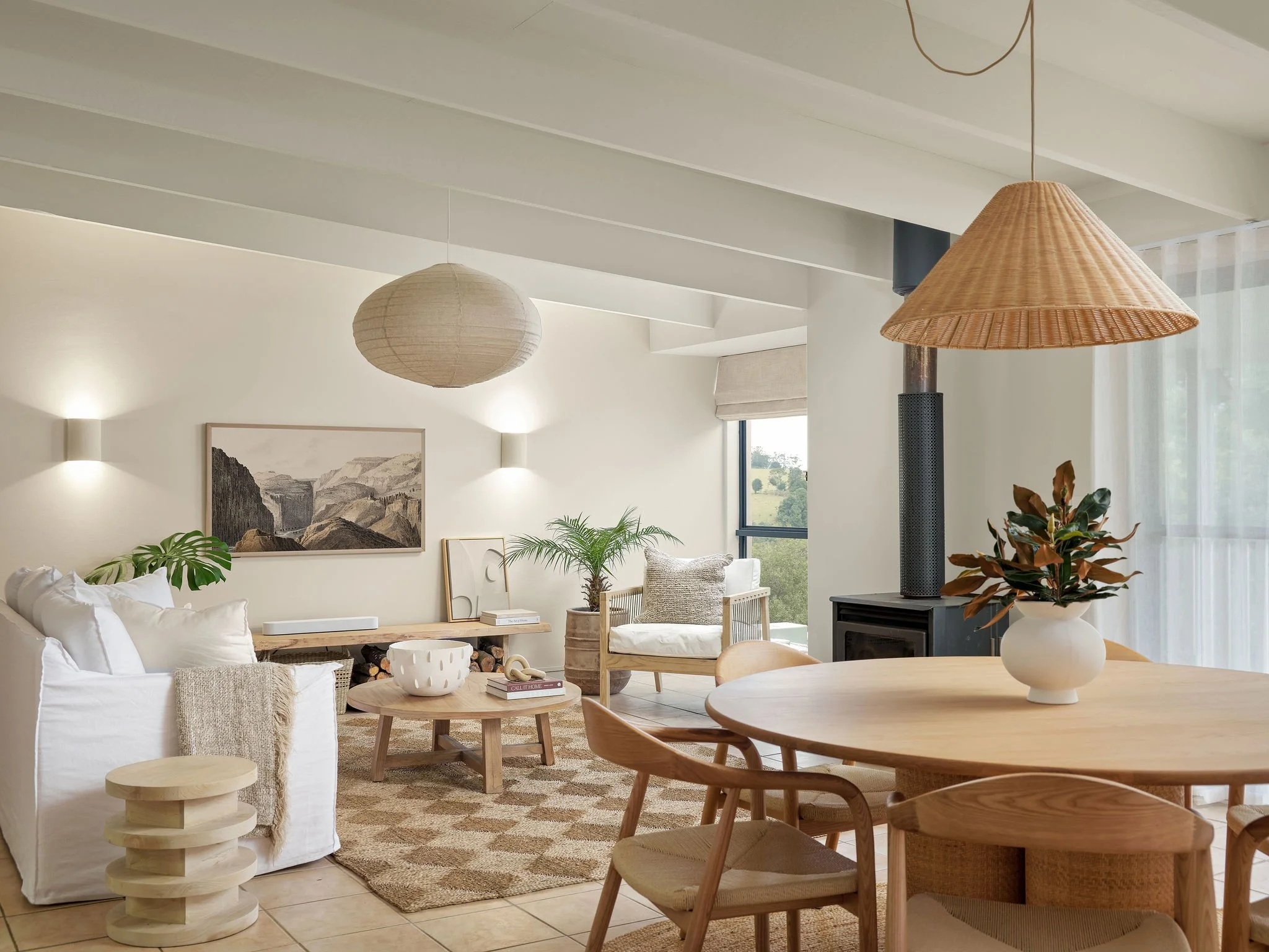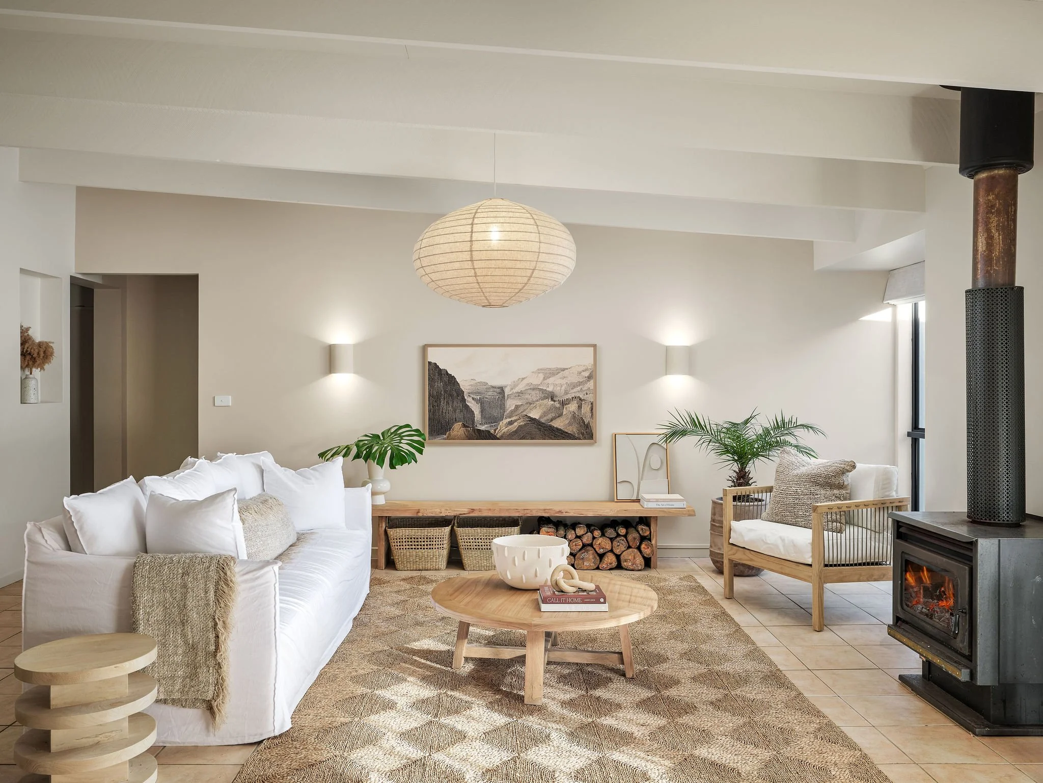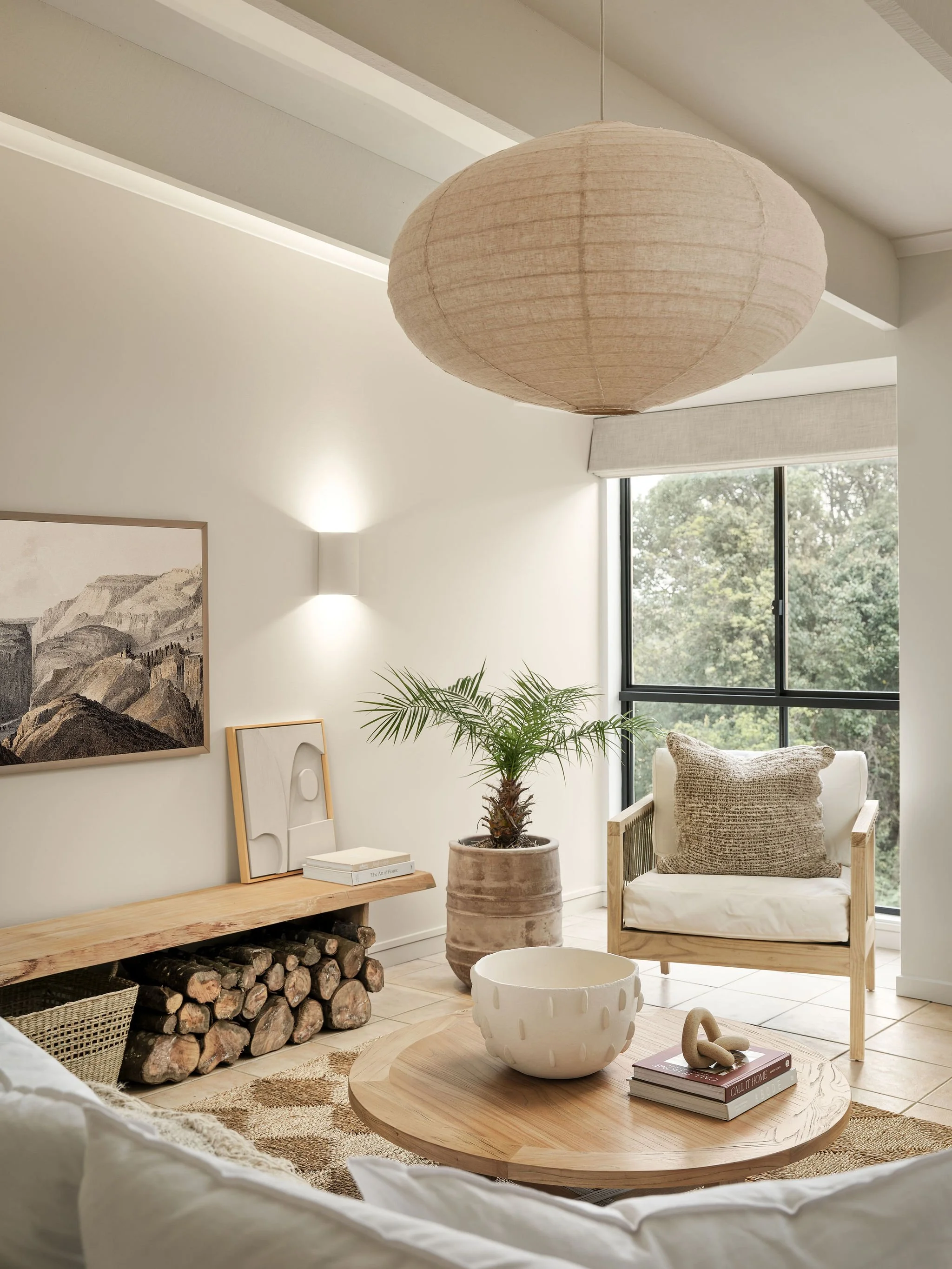 The other major improvement we made to the space was replace all of the lighting. Prior to our makeover, the existing lights didn’t give a lot of light at night, we found this room dark and dismal. I had the wall lights replaced with these stunning ‘Fjord’ up/down wall lights from Beacon, and also moved them down so they weren’t sitting up so high. These are a creamy stone colour, made from concrete with a slightly dimpled texture. They work so well with our wall colour, I just love the amount of light they produce too, it’s no longer dark and dingy at night. I also replaced the ceiling fan with this stunning ‘Tamarind’ natural pendant light from Beacon - it has a lovely warm glow at night, and I love the proportion of it with the space too - it just feels like it’s meant to be in here.
