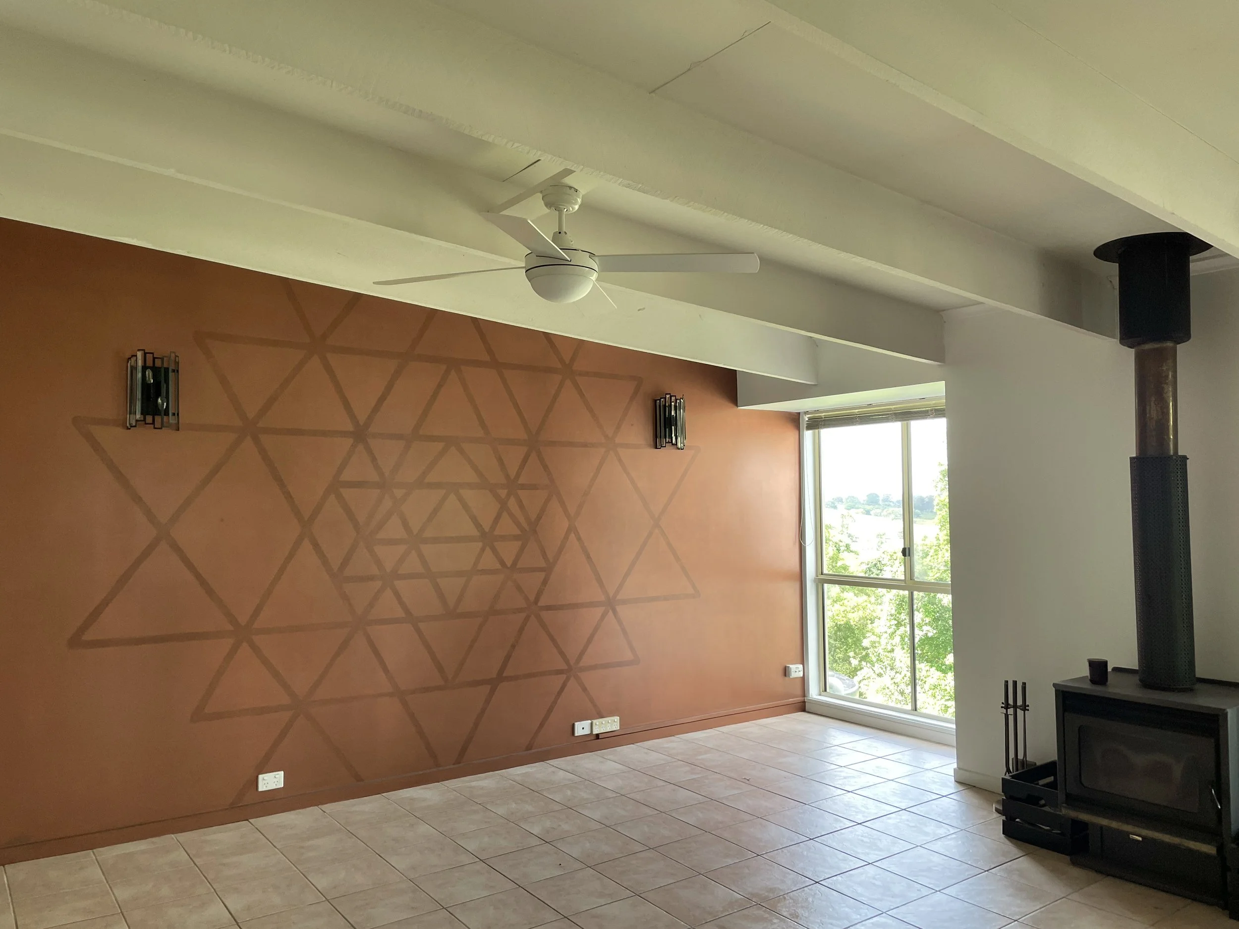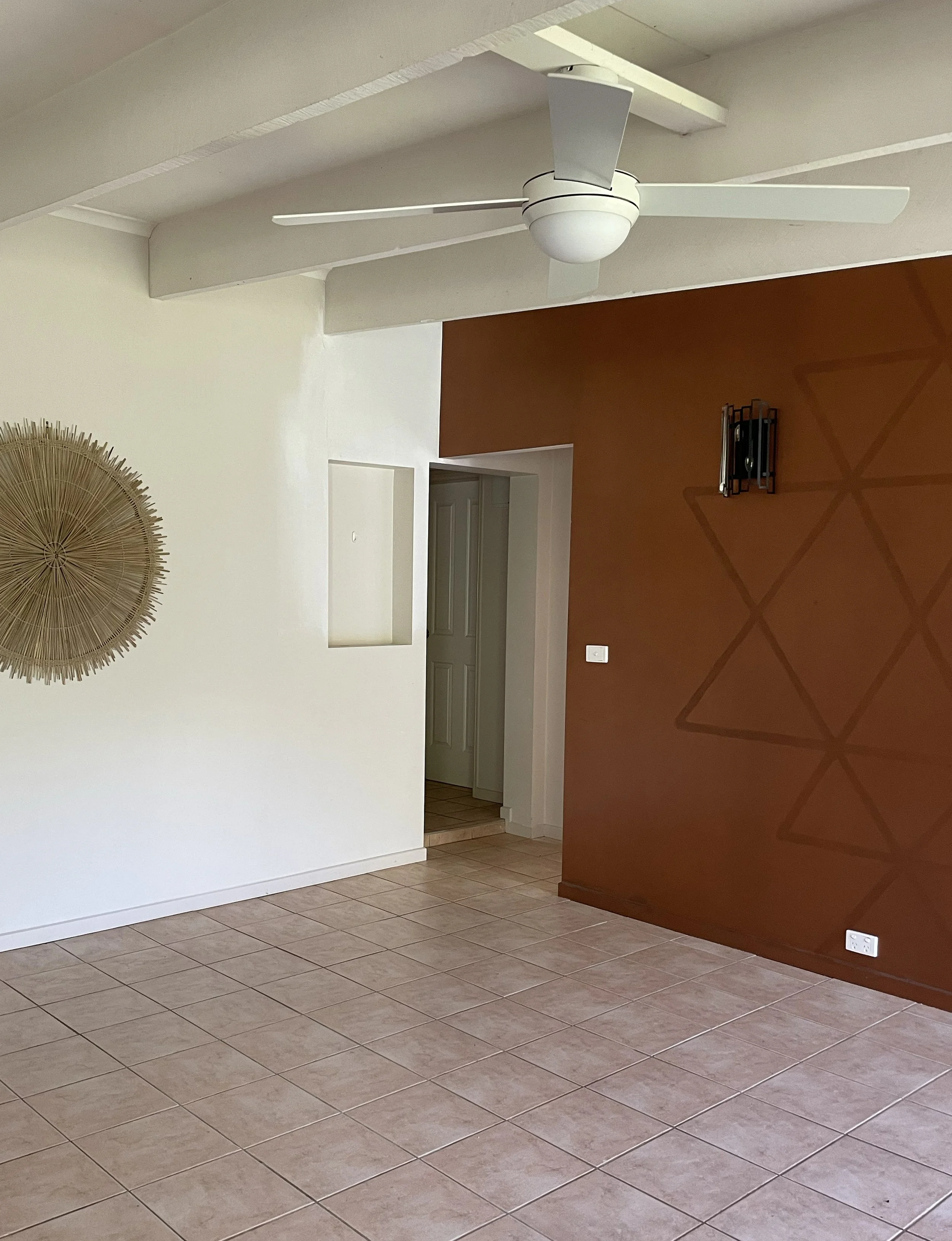 Let’s start at the beginning – I was not a fan of that painted mural on the wall or those wall lights so I have to say it was with absolute joy that both of those things got an update! I’m also not a fan of the faux terracotta floor tiles however the budget simply didn’t allow for new flooring at this stage, so using large rugs to cover up the floor was the way to go! The ceiling fan was a bit pointless due to this space having an air-conditioner, plus the light on it wasn’t generating much light anyways, so we decided to replace that as well.